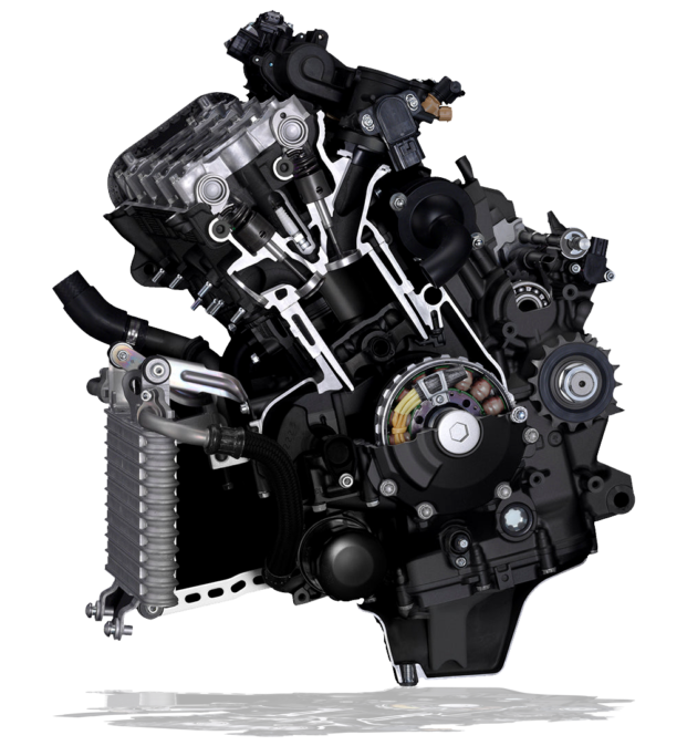 Titanium connecting rods use Yamaha’s precision fracture-split method to ensure maximum reliability with minimal weight. Combined with titanium intake valves and forged pistons, these lightweight parts help achieve the CP4’s high redline and over-rev capability. The cylinder block is also offset from the crankshaft, reducing friction loads on the pistons and bores.