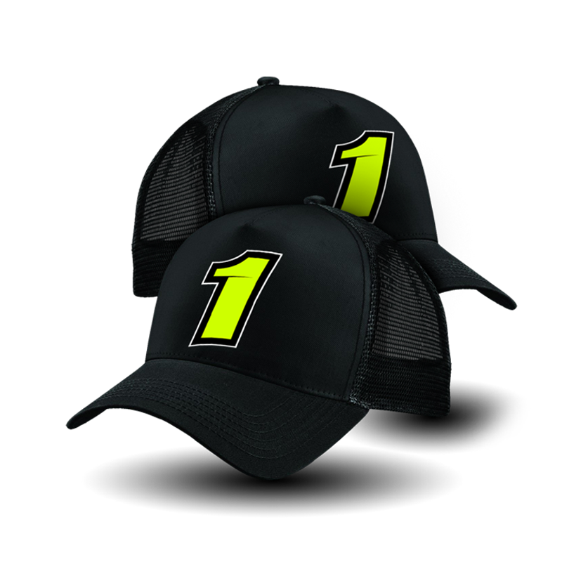 Official Kyle Ryde BLACK Mesh Trucker style cap  – Including fluroescent 1 embrodiered logo to front area.