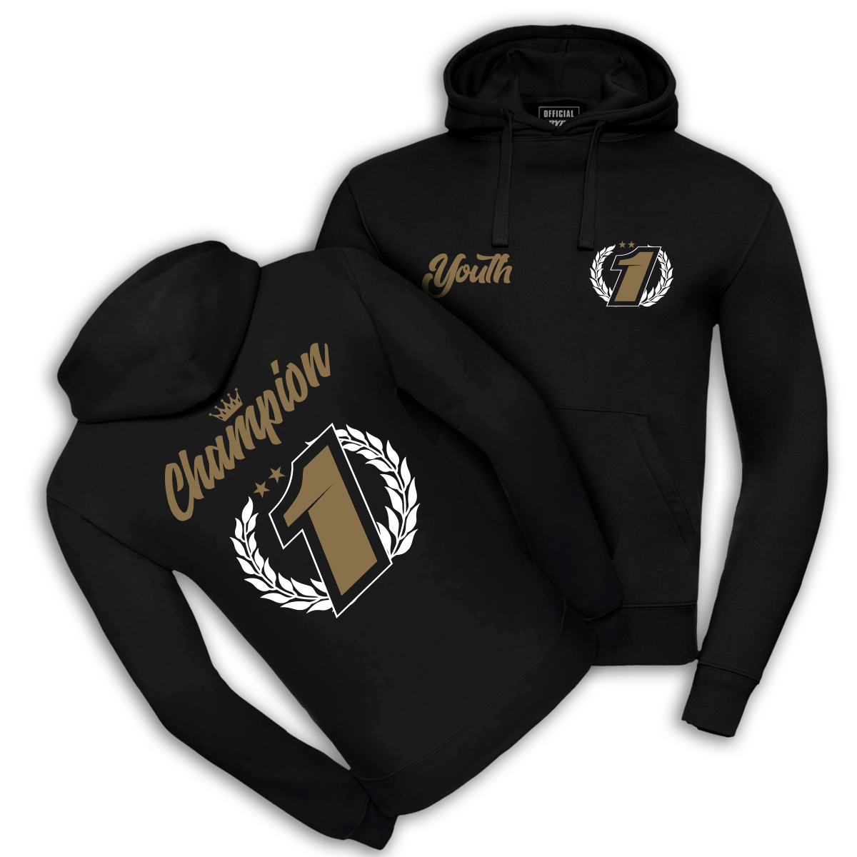 Your chance to get your hands on a limited edition #1 Championship winning Hoodie. Black Hoodie, Screen printed with white and gold print.